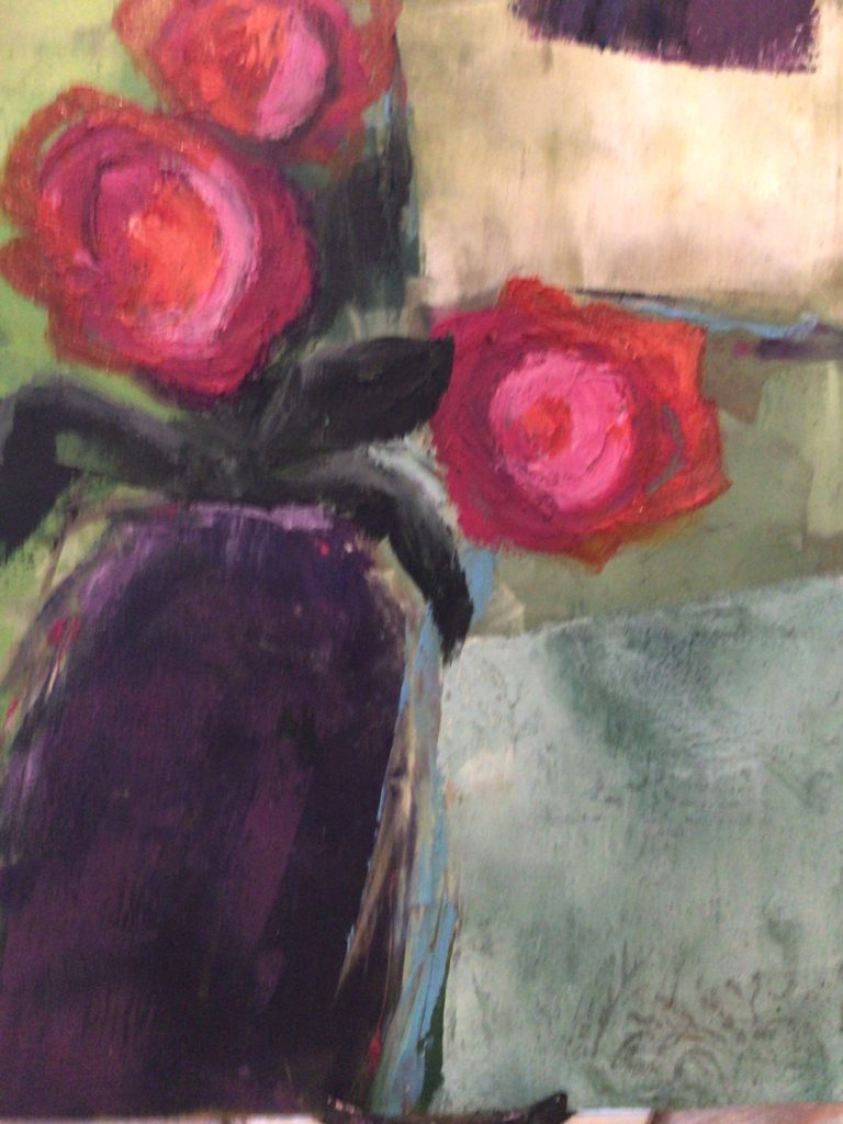 I started out copying a vase of flowers with the intention of abstracting them somewhat.  This is what I ended up with…nothing like the flowers.  I need to work on the leaves and perhaps do some mark making and anything else you can suggest.  It is definitely funky!