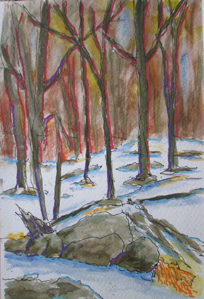 Les 2/11 Feb 11, 2022 | Les Melting Woods 3 Comments Margaret on February 11, 2022 at 2:29 pm Really nice mark making, les. It’s a complicated scene and you simplified it nicely Reply Susan on February 12, 2022 at 8:02 am I love your the spontaneous feel you get with your lines of black and color. It keeps my eye moving around and wondering! Reply Adrienne on February 12, 2022 at 2:05 pm I like how you treated the background to bring me deep into the woods. Reply Submit a Comment Cancel replyYour email address will not be published. Required fields are marked *Comment * Name Email Δ