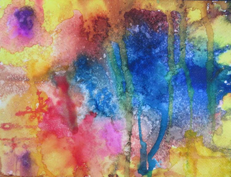 Starting with the Fluid WC’s on prestretched wet WC paper and then after drying went back in with the Waterbased Inks for the darker values spraying the areas with water, all done with pouring and turning and spraying, no tools.