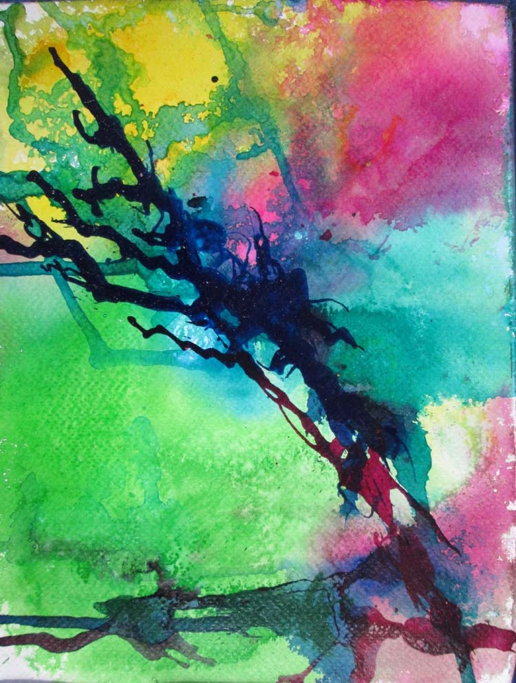 Starting with Fluid watercolors and watercolor inks on wet prestretched WC paper after drying using the fluid acrylic inks for darker values, pushing some of it around with end of brush and allowing dripping.