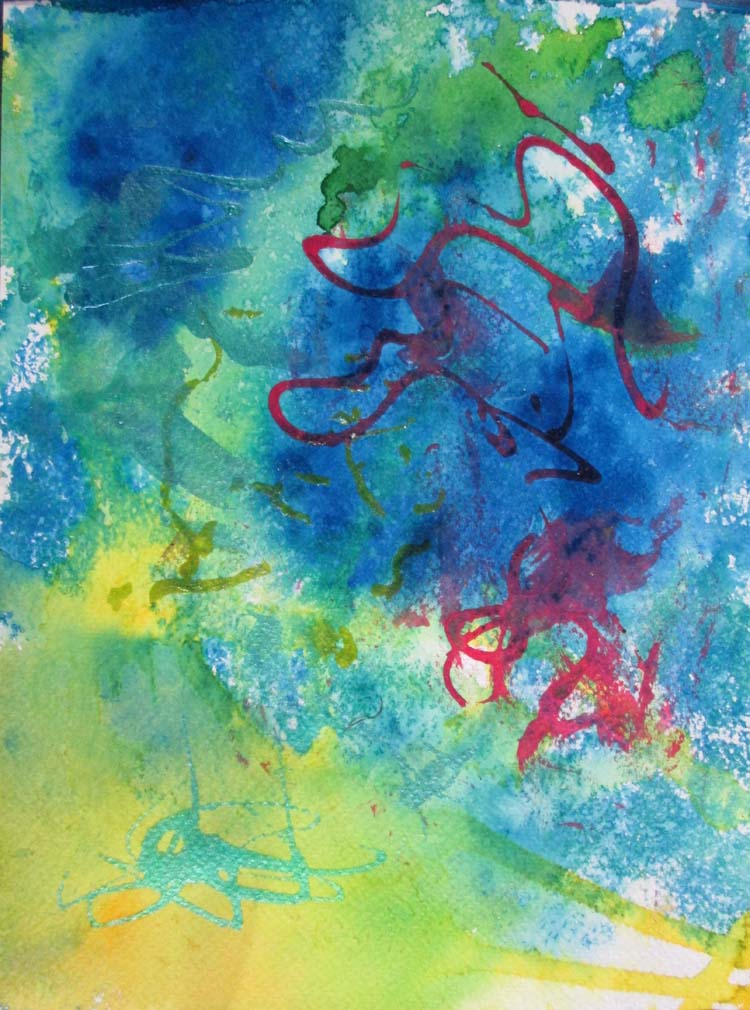 Starting on dry stretched WC paper made swirls with acrylic ink, after dry. Wet the paper and used Fluid WC and Waterbased Inks which allowed the swirls to show through.