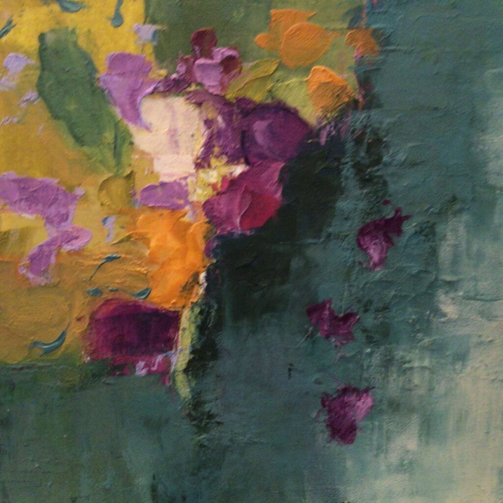 Sharon 5/20 May 20, 2022 | Sharon I haven’t been painting, but thought I would send this one I did a while ago. 3 Comments Deb on May 20, 2022 at 8:43 am This is lovely. The dark area really makes the color stand out. Reply Margaret on May 20, 2022 at 8:52 am It looks like the flowers are being ‘carved’ from the dark and slowly coming forward. If i stare i feel there is a lot going on in the dark area also! Reply Susan on May 22, 2022 at 8:42 am The dark blue green, red violet and orange are such a succulent color combo. The dash of pure orange bring all the pieces of color together for me. There looks like there is a rich textural element as well. Beautiful! Reply Submit a Comment Cancel replyYour email address will not be published. Required fields are marked *Comment * Name Email Δ