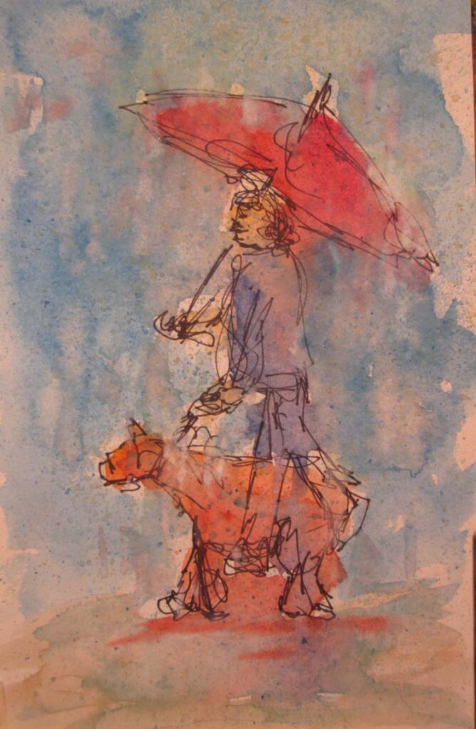 What a wonderfully loose and gestural drawing. I love the way the transparent paint allows us to look through the dog and see the legs of the walker at the same time we see the movement of the dog. Very happy walk in the rain!