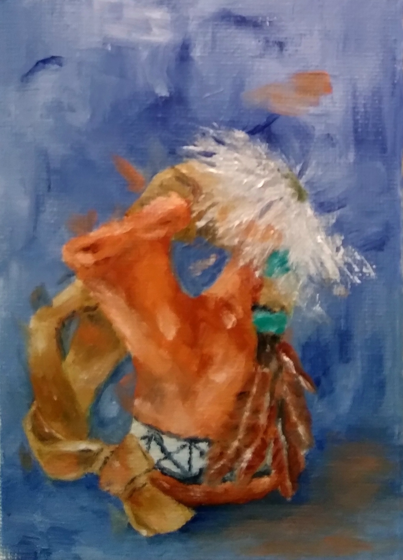 I agree with Les… this looks like something to do with a tribal dance. I love the way you did the feathers… They look like they could spring right off the canvas!