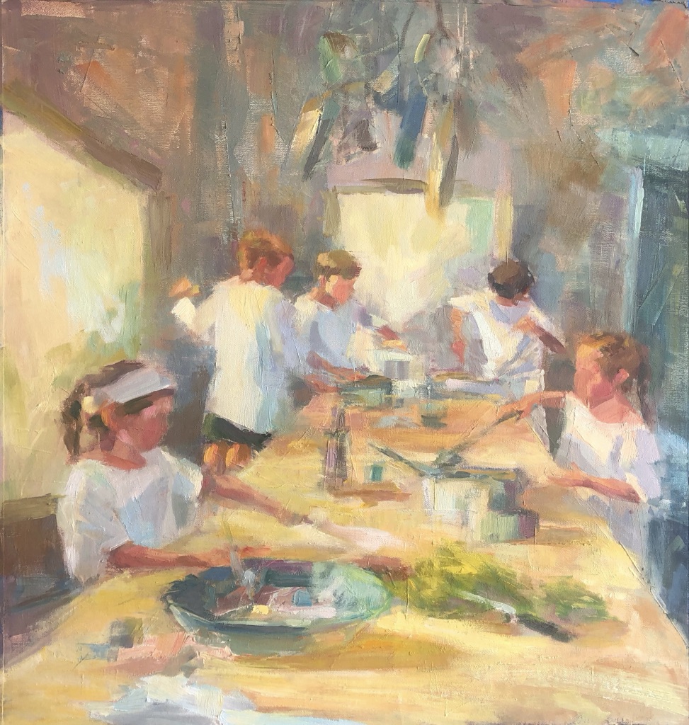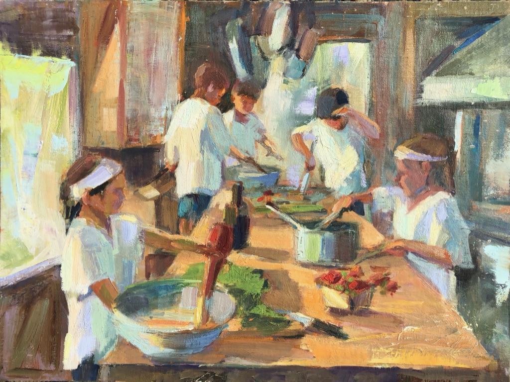 In the redo I decided to eliminate the unnecessary, keep the table “stuff” more suggestive, and try to express the energy by making the painting high key. I wanted to keep the focus on the cooks. I switched to a square format.