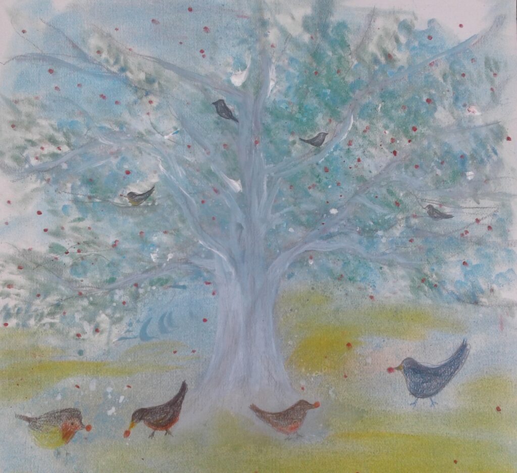 The birds are wonderful, feasting on cherries! To me it almost looked like a Christmas card at first. It’s charming!