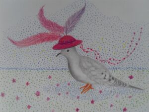 She’s a mascot for the Red Hat Ladies, strutting her stuff. Your drawings are amazing.