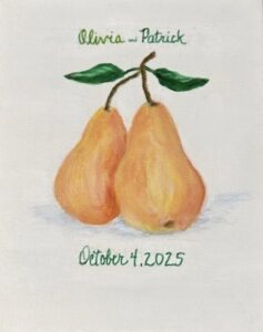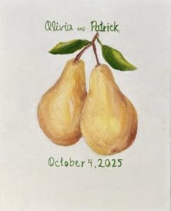 Gemma 8/29 Aug 30, 2025 | Gemma This is in oil. This is in acrylic. 5 Comments Deb on August 30, 2025 at 3:42 pm Both are beautiful! I wouldn’t have known if you hadn’t told us. I wonder which you enjoyed more. Reply Les on August 30, 2025 at 4:46 pm Looking good, the big day is not far away. Hope you are doing well, hope to see more of your art this fall and winter. Les Reply Margaret on August 30, 2025 at 8:40 pm Very nice and best wishes to them! How nice they can have this personal touch Reply Susan on September 2, 2025 at 6:39 am Gemma these are beautiful pears! My favorite is the oil… it has a sculptural quality to me. Elegant simplicity! I’m sure Olivia and your grandson were thrilled… Reply Lynda on September 3, 2025 at 1:51 pm What a beautiful gift! They will treasure these. Reply Submit a Comment Cancel replyYour email address will not be published. Required fields are marked *Comment * Name Email Δ