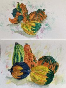 Les 10/10 Oct 11, 2025 | Les Another blind contour before painting 4 Comments Deb on October 11, 2025 at 2:41 pm Good practice with a lovely result. Reply Lynda on October 11, 2025 at 6:22 pm I especially love the lines in the contour along with the splashes of color surrounding the squash. These are so neat! Reply Susan on October 13, 2025 at 7:25 am I love all the nubby bumps and creases with that bold color! Reply Maureen on October 23, 2025 at 3:03 pm Fall is in the air! I always love to see all the marks and lines in your work and I too like all the nubby bits on these gourds they are so beautifully textured. Reply Submit a Comment Cancel replyYour email address will not be published. Required fields are marked *Comment * Name Email Δ