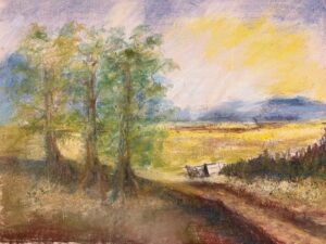 This week feels messy when I got to working on the values for the trees. I may have taken on too much too soon yet I’m finding in this one, I like how the dust has added some depth to the field and the edges alongside the path.