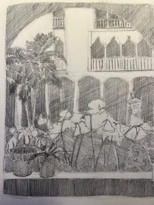 This is a drawing from a photo of the courtyard at the Isabela Stuart Gardner museum . It was very overwhelming with all the detail so I just worked in pieces like a zentangle . It took a while but quite fun.